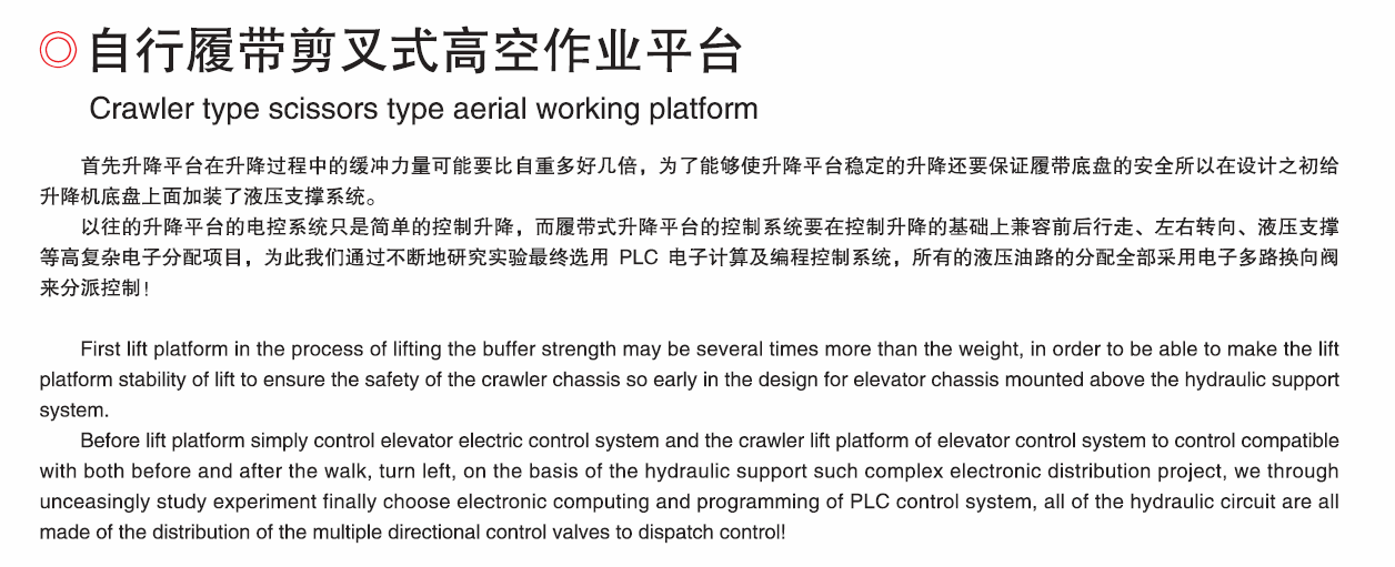 履帶式鋁合金升降機(jī)是我們專為野外復(fù)雜路況下高空作業(yè)設(shè)計(jì)的一種鋁合金升降機(jī),它適應(yīng)環(huán)境能力特別強(qiáng),能在野外無電源,路況復(fù)雜的情況下進(jìn)行高空作業(yè)。它采用履帶式車輪,加重底盤,由柴油發(fā)動(dòng)機(jī)驅(qū)動(dòng)升降機(jī)行走,蓄電池做控制和升降電源,通過控制按鈕控制驅(qū)升降機(jī)上升和下降,也可以用柴油發(fā)動(dòng)機(jī)做升降動(dòng)力通過手動(dòng)液壓操作桿控制升降機(jī)升、降,蓄電池由外接電源充電或通過柴油發(fā)動(dòng)機(jī)帶動(dòng)發(fā)電機(jī)充電。履帶式鋁合金機(jī)采用加重底盤,工作時(shí),不需要支腿,在升降機(jī)升起后,不需要不把升降機(jī)收起即可行走,極大的提高了工作效率,同時(shí),它的履帶式車輪,增加了與大地接觸的面積,在野外泥濘道路上也可行走和工作,是石油勘探、野外通信線路安裝施工等野外高空作業(yè)的理想設(shè)備。